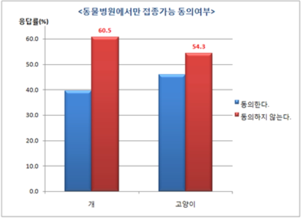 예방접종을 동물병원에서만 하도록 규제 하는 것에 대해서는 개 보호자의 60.5%가 '동의하지 않는다'고 답했다.