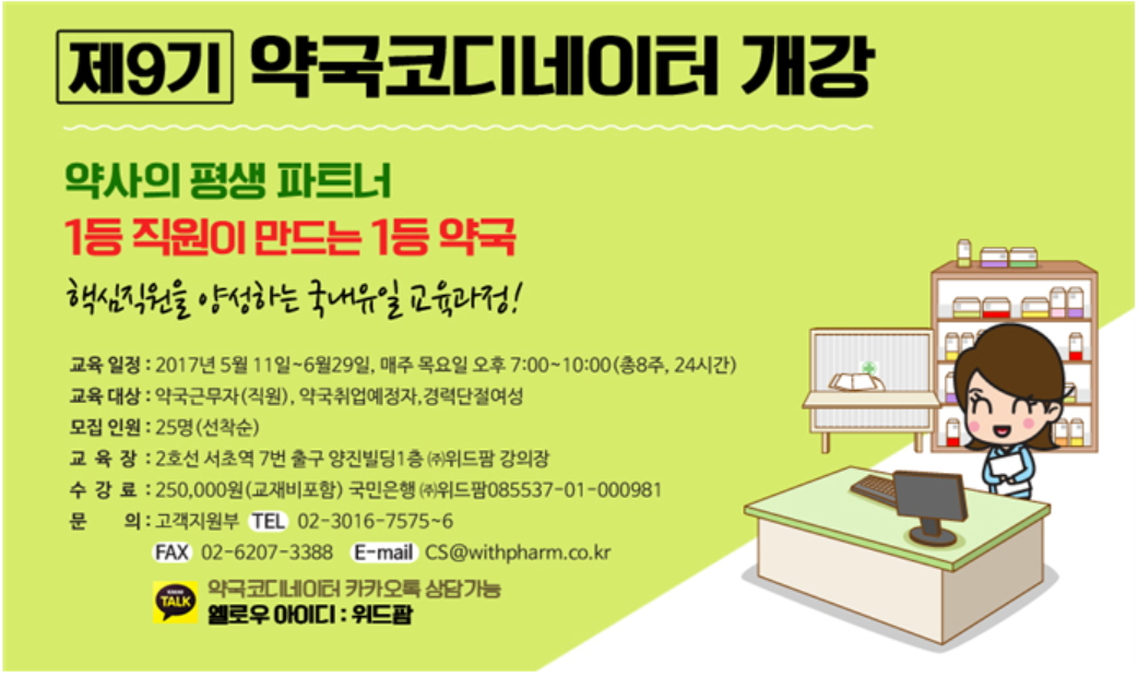 제9기 약국코디네이터 과정은 오는 5월 11일부터 6월 29일까지 총 8주간 매주 목요일 저녁 7시부터 10시까지 서초동 위드팜 본사 교육장에서 진행된다.