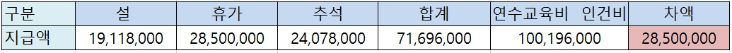 당시 하계휴가비를 현금으로 지급해 지급 확인을 영수증 사인으로 진행, 장부상 5,700만원이었으나, 실지급액은 2,850만원으로 장부상 총 1억 19만 6천원이 지급됐어야 하나, 실지급액은 7,169만 6천원이었다.