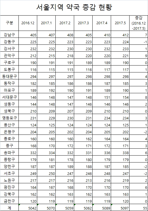 약업닷컴(www.yakup.com)이 건강보험심사평가원이 집계한 약국 개페업 현황을 분석한 결과, 2017년 5월말 현재 서울 25개구 약국 수는 5,097개로 지난해 연말의 5,042개보다 55곳 늘어났다.