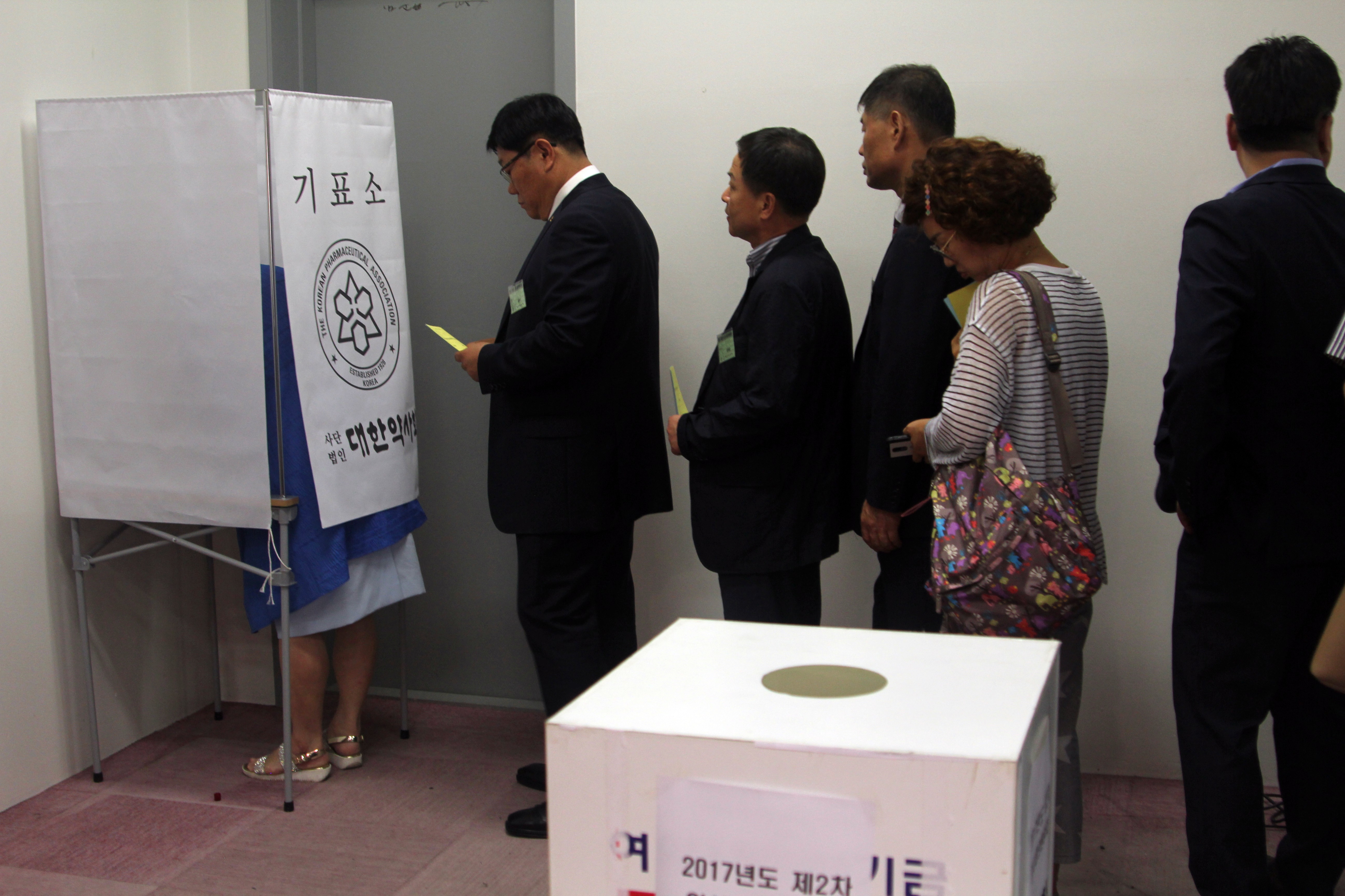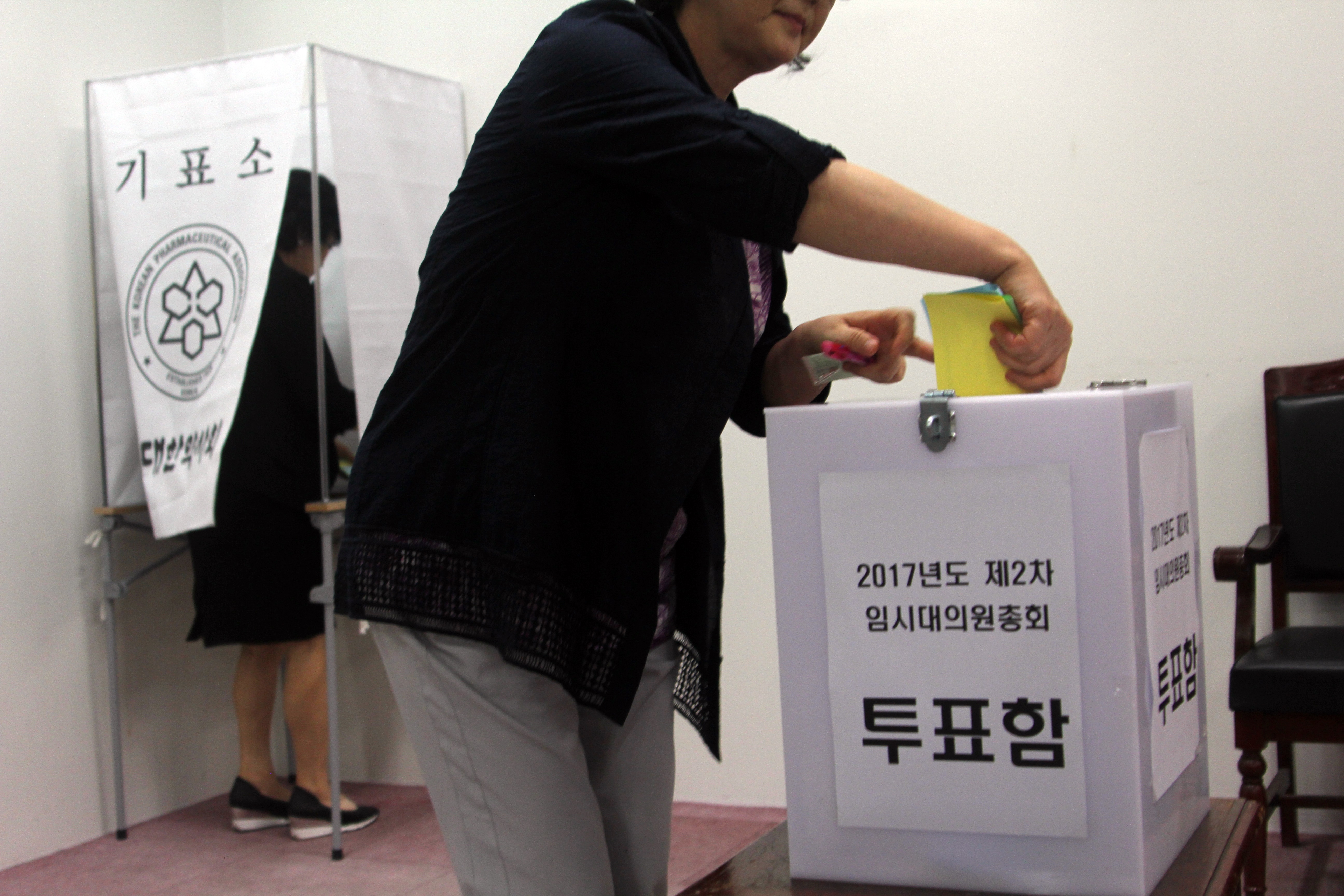 18일 열린 대한약사회 임시대의원총회에서 대의원들의 불신임 안건에 대한 투표가 진행되고 있다.