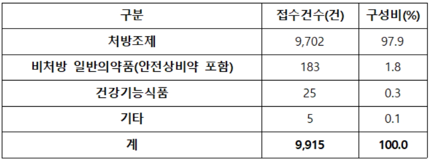 이 중 한국의약품안전관리원의 보고시스템인 KAERS 통해 접수된 88건을 제외한 대부분인 9,915건은 대한약사회 이상사례보고 시스템을 통하여 접수된 건으로 처방조제 의약품이 주로 보고되었으며, 처방 없이 구매가능한 일반의약품이 183건, 건강기능식품도 25건이 보고 됐다.