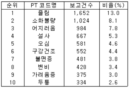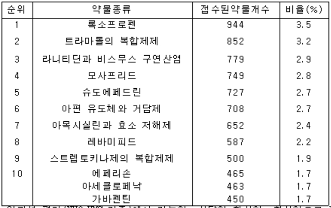 다빈도로 보고된 약물 성분은 록소프로펜 (3.5%), 트라마돌의 복합제제 (3.2%), 라니티딘과 비스무스 구연산염 (2.9%)의 순으로 나타났는데 소염진통제나 소화기관용 약물이 상위권을 차지했다.