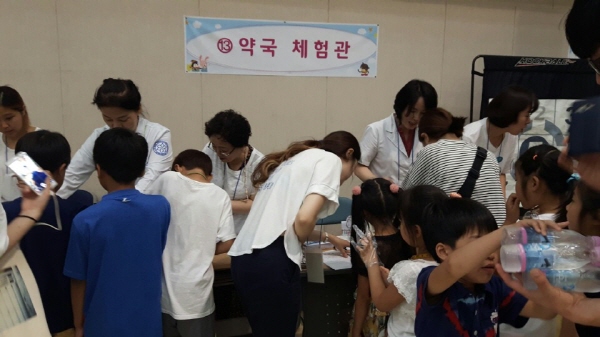 약국체험교실에서는 처방조제 실습과 의약품 올바른 사용 교육이 이뤄졌으며 어린이들이 좋아하는 터닝메카드, 헬로우 키티, 카카오프렌즈 등 캐릭터 비타민과 일회용 밴드를 선물로 나눠줬다.