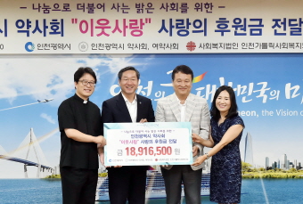 인천광역시약사회(회장 최병원)는 인천시청에서 ‘사랑의 후원금’ 1,891만6,500원을 사회복지법인 인천가톨릭사회복지회에 전달했다.