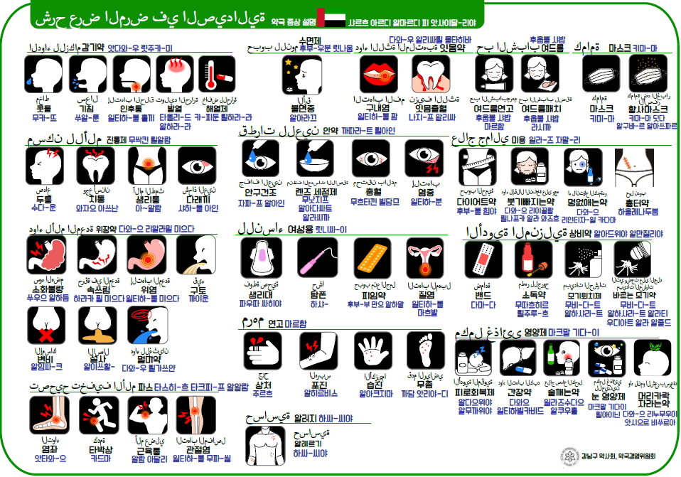 하나는 각 국가의 환자가 국내 약국을 찾아 주로 호소하는 증상이나 의약품 종류를 간단한 아이콘과 그 나라 언어, 우리말로 제작한 것이다.