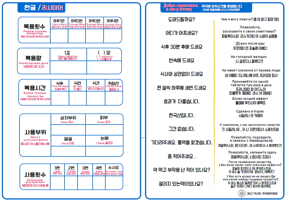 서울 강남구약사회(회장 신성주) 약국경영위원회(부회장 조보선,위원장 신은경)는 지난 2016년 5월 3개국어(영어,일어,중국어)외국인 복약지도 상담 안내문 제작 배포에 이어, 올해에는 러시아어와 아랍어, 2개국어 외국인복약지도 안내문을 제작하여 각 반회를 통해 전체 약국에 배포 예정이다.