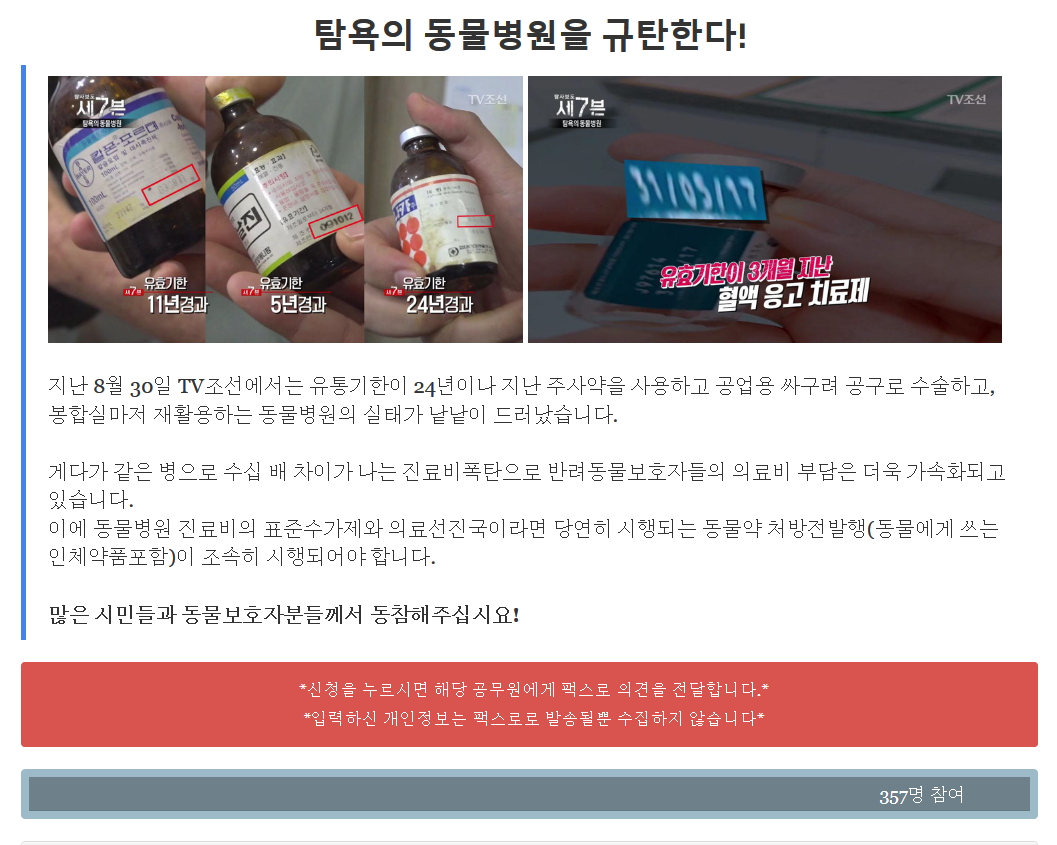 이에 동물약국은 "동물병원 진료비의 표준수가제와 의료선진국이라면 당연히 시행되는 동물약 처방전발행(동물에게 쓰는 인체약품포함)이 조속히 시행되어야 한다"고 주장하며 "홈페이지 링크(http://anipharm.net/minwo)를 통한 서명운동에 동참해 줄 것"을 호소했다.