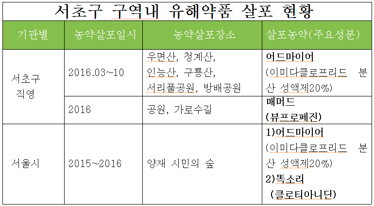 서초구와 서울시가 발암의심물질 농약을 서초구 관내 공원과 가로수 및 양재동 시민의 숲에 사용했다는 주장이 제기됐다.