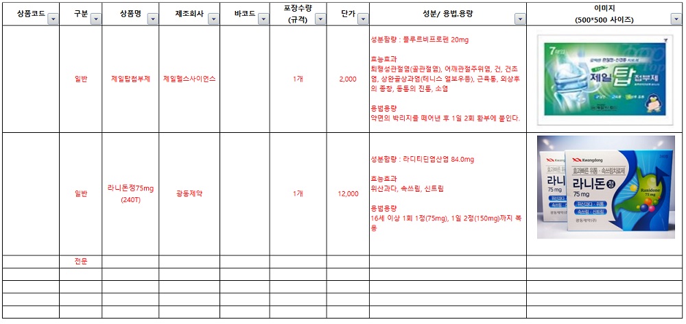 요청되는 정보는 각 제약사의 신제품리스트별 △상품명 △상품코드 △바코드 △포장수량(규격) △단가 △성분 및 용법·용량 △이미지 등이다.