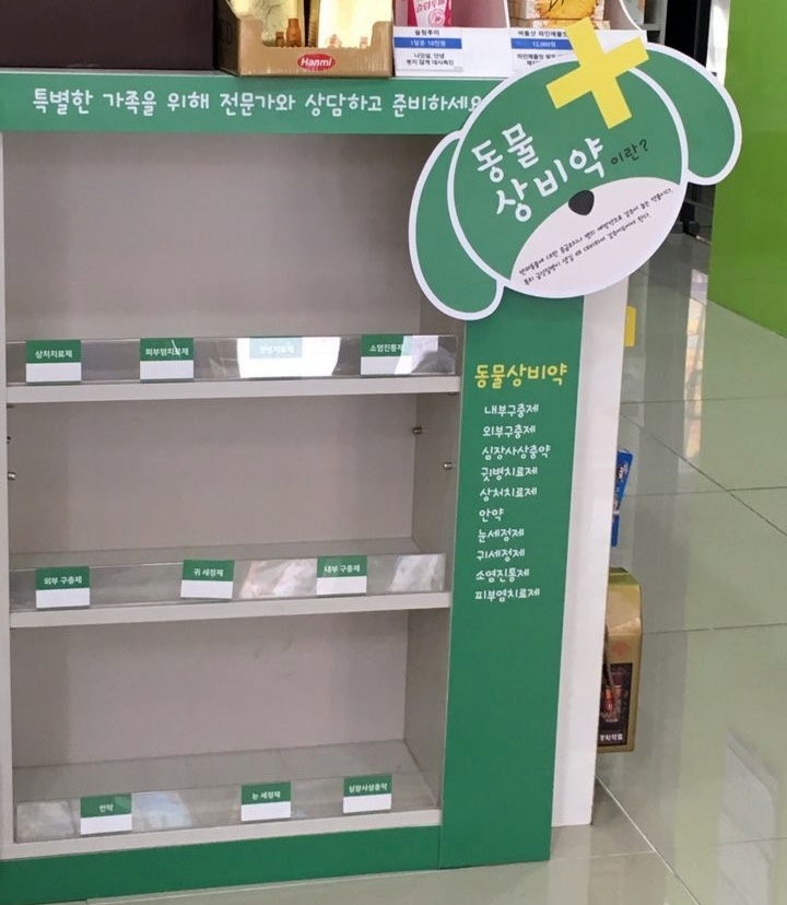 진열되는 동물상비약은 △내부구충제 △외부구충제 △심장사상충약 △귓병치료제 △상처치료제 △안약 △눈세정제 △귀세정제 △소염진통제 △피부염치료제 등이다.