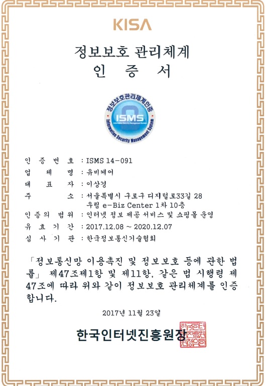 헬스케어 솔루션 대표기업 유비케어(대표 이상경)는 한국인터넷진흥원(KISA)으로부터 헬스케어 업계 최초로 전사의 모든 서비스에 대해 정보보호 관리체계(ISMS, Information Security Management System) 인증을 획득했다고 14일 밝혔다.