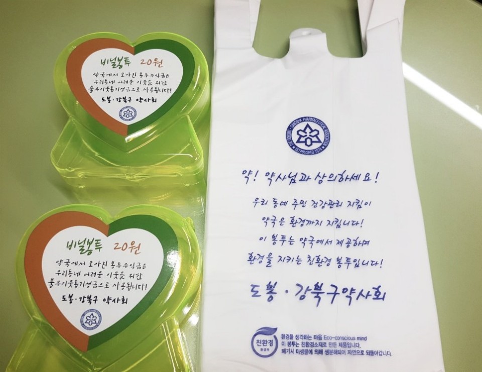 도봉·강북구약사회(회장 최귀옥)에서는 비닐봉투값용 ‘저금통’ 과 ‘친환경 비닐봉투’를 제작했다.