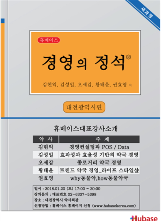 휴베이스에서는 매월 셋째 주 토요일 '약국 경영의 정석'이라는 타이틀로 1월 대전을 시작으로 2월 진주·마산·창원, 3월 포항·경주의 각 주요 도시에서 전국투어를 진행 할 예정이다.