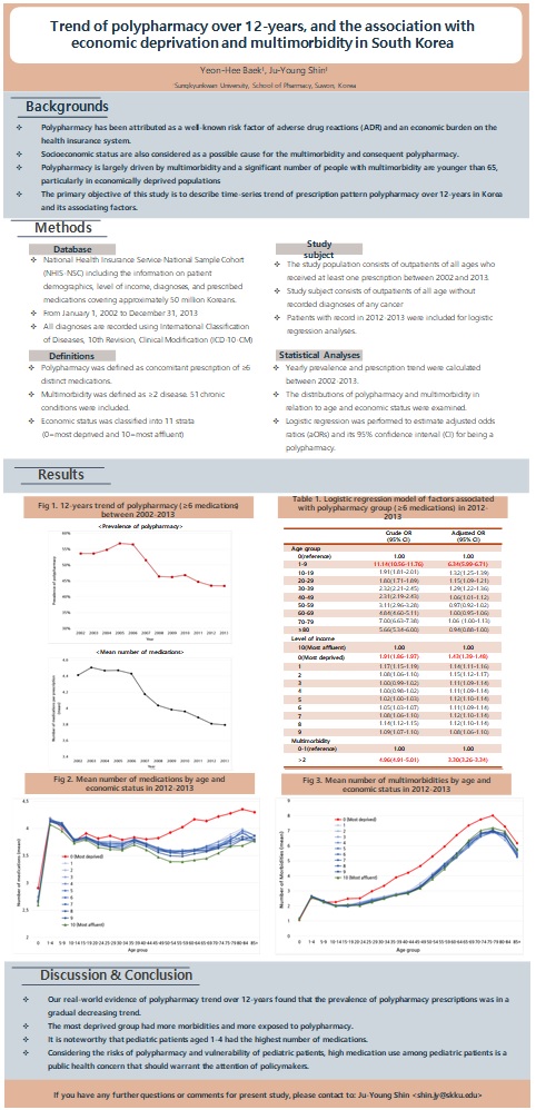 최근 한국보건사회약료경영학회에 발표된 '외래방문 환자에서 지난 12년 간의 다제병용 추이와 경제적 지위 및 다중질환간의 관련성 분석(Trend of polypharmacy over 12-years, and the association with economic deprivation and multimorbidity in South Korea, 성균관대 약물역학연구실 석박통합과정 백연희, 교신저자 신주영 교수)'에서는 이같은 내용의 연구결과가 나왔다.