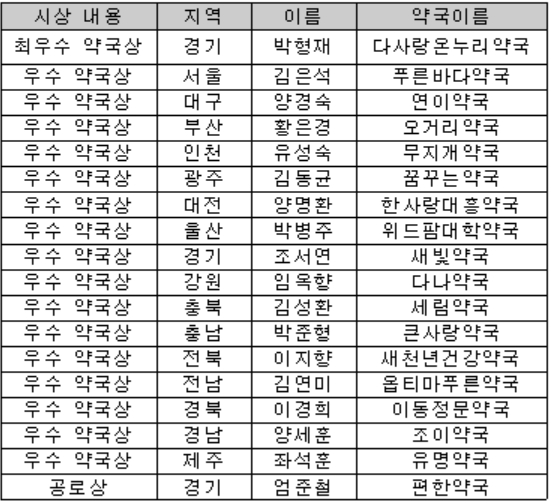 부작용보고 최다 최우수 약국상에는 박형재 약사(다사랑온누리약국)를 비롯해 지역별 16명의 약사에게 우수 약국상을 수여했으며, 부작용 보고 활성화를 위해 다양한 활동을 진행한 엄준철 약사(편한약국)에게는 공로상이 수여됐다.