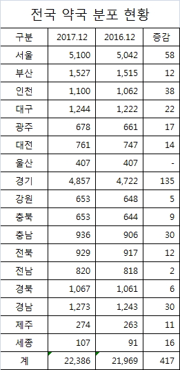 건강보험심사평가원이 집계한 2017년 12월 현재 전국 약국은 2만 2,386곳으로 2016년의 2만 1,969곳에 비해 417곳 증가한 것으로 집계됐다.