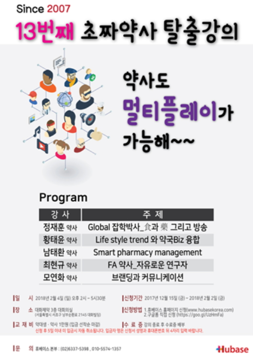 약사, 약대생, 예비약사를 위한 초짜약사탈출기 강의(휴베이스 주관)가 오는 2월 4일 일요일, 대화제약 신사옥 3층 강당에서 개최된다.