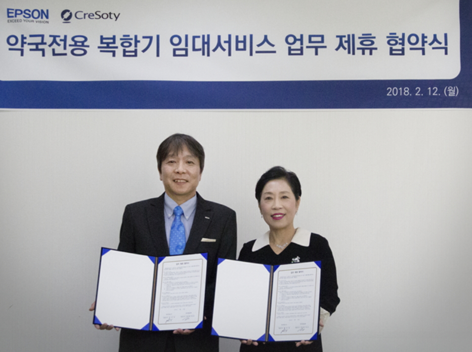 한국엡손과 크레소티는 12일 프린터 임대 서비스 MOU를 체결, 이번 MOU는 한국엡손에서 2018년에 새롭게 출시된 ‘완성형 정품무한 복합기 L6190’모델을 통해, 약국에서 인쇄하는 전산봉투 및 각종 출력물을 저렴하고 퀄리티 높은 인쇄품질로 출력 할 수 있게 되었다.