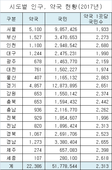 행정안전부가 집계한 2017년 우리나라 총인구수는 5,177만 8,544명, 2017년말 전국 17개시도 약국수는 2만 2,386개소로 약국 1곳당 국민수는 2,313명으로 집계됐다.