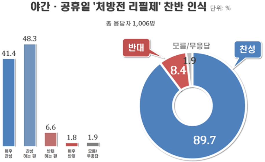 이번 인식조사에서는 이 밖에도 취약시간대 국민들의 의료불편을 해소하기 위해 ‘처방전 리필제’ 도입에 89.7%, ‘의원-약국 당번제’ 운영에 96.1%, ‘보건소에 공중보건의사와 공중보건약사 배치’에 89.3%가 찬성하는 것으로 조사되어 국민들의 취약시간대 의료불편을 해소하기 위한 정부의 제도개선 요구가 절대적으로 높은 것으로 조사됐다.