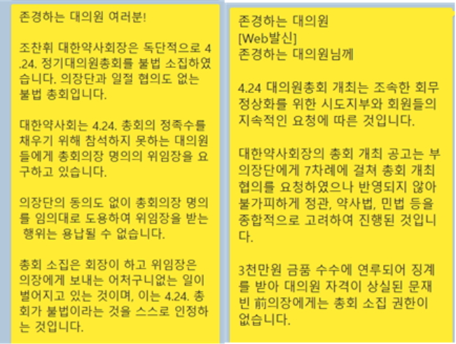이에 같은날 조찬휘 회장도 대의원문자 발송을 통해 "총회 개최 공고는 부의장단에게 7차례에 걸쳐 총회 개최 협의를 요청하였으나 반영되지 않아 불가피하게 정관, 약사법, 민법 등을 종합적으로 고려해 진행된 것"이라며 "불참시 위임장을 제출해 달라"고 전했다.