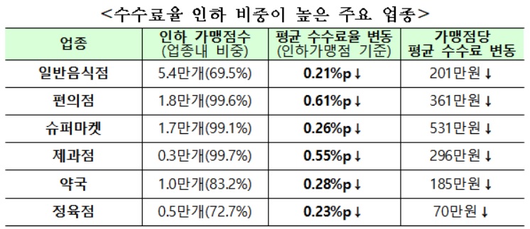업종별로는 일반음식점, 편의점, 슈퍼마켓, 제과점, 약국, 정육점 등 주로 골목상권의 가맹점을 중심으로 수수료율이 인하된다.