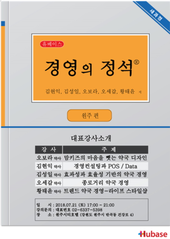 약사가 즐거운 약국 휴베이스(대표이사 홍성광)에서 지식나눔 프로그램의 일환으로 오는 7월21일 토요일 원주시티호텔 세미나실에서 '약국 경영의 정석' 타이틀로 약국 실전 강의가 진행될 예정이다