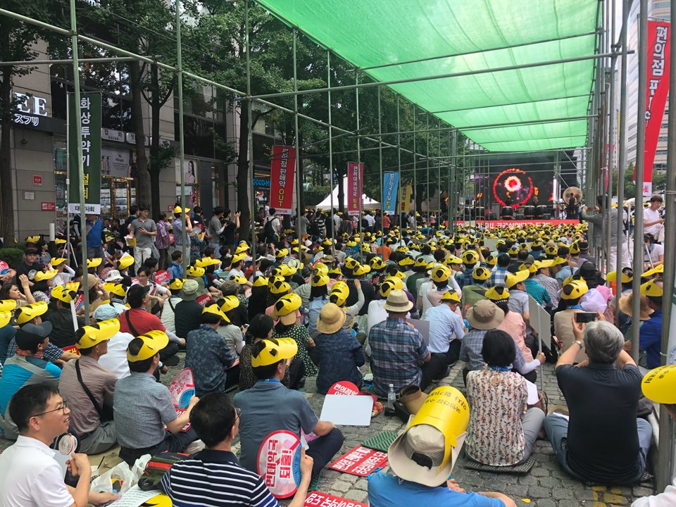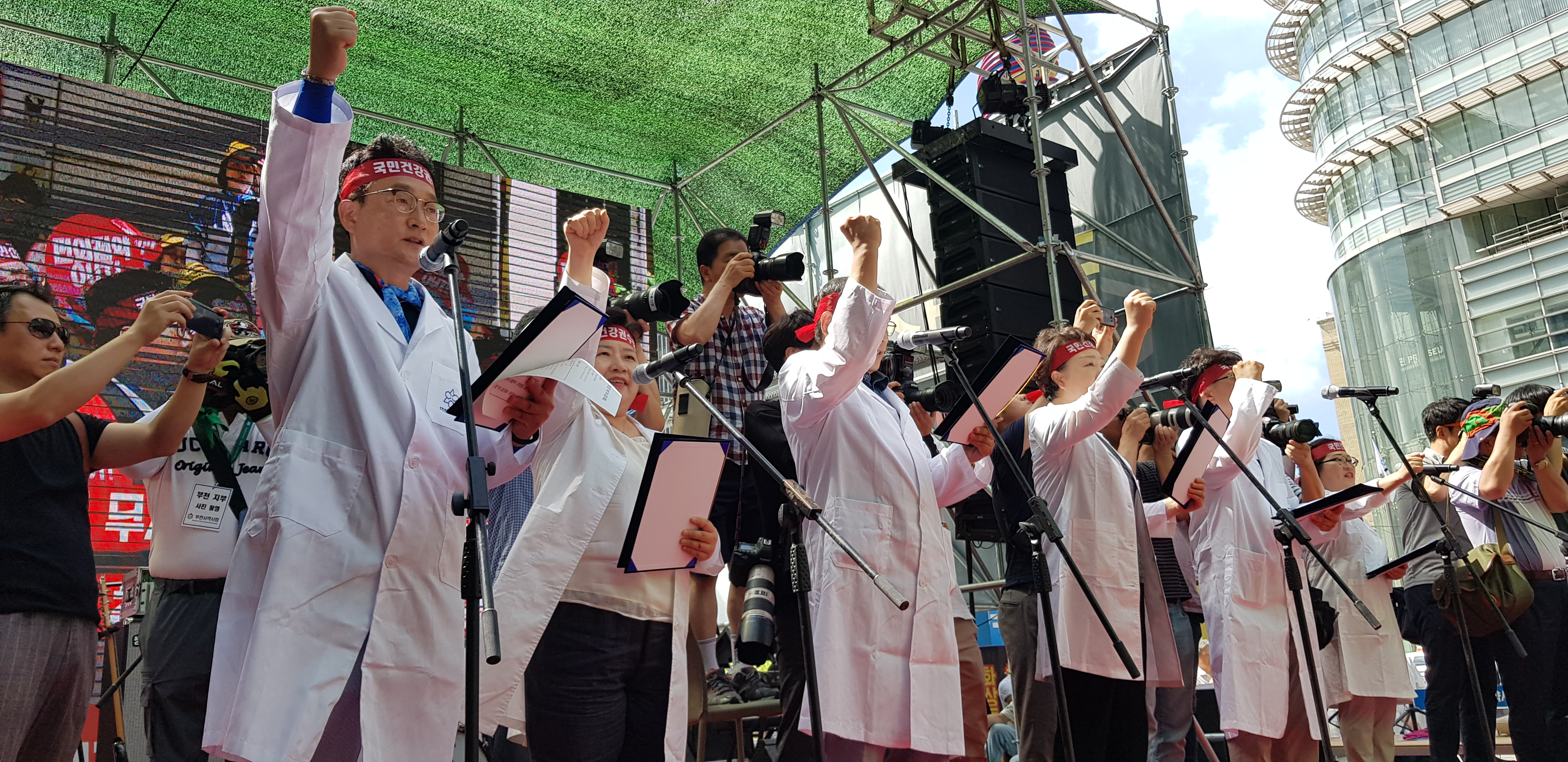 무더위 속 약사 3천여명이 거리로 나섰다. 약사들은 정부의 의약정책을 강하게 비판했다.