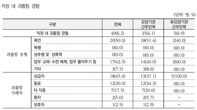 직장 내 괴롭힘을 경험한 경우는 응답자의 6.2%였다. 요양기관 근무인력의 경우 괴롭힘 경험률이 6.1%였으며, 非의료기관 근무인력은 6.9%였다.