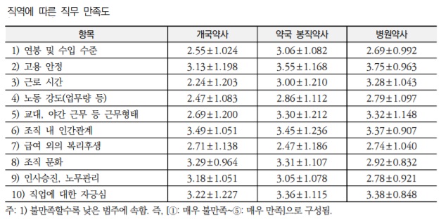 직역별로는 개국약사의 경우 '근로 시간'에서 가장 낮은 직무 만족을 느꼈으며, '조직 내 인간관계'에서 가장 높은 직무 만족을 느꼈다.