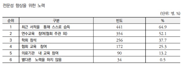 이어 '연수교육 참여(협회 주관 외)' 52.1%, '학회 참석'이 37.7%였으며, 전문성 제고를 위해 별다른 노력을 하고 있지 않다는 응답은 0.5%(34명)인 것으로 조사됐다.