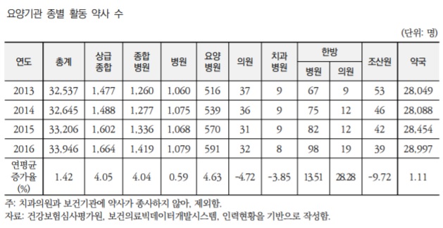 지역별 요양기관 활동 약사는 2013년부터 2016년까지 연평균 증가율은 세종에서 20.51%로 가장 높았고, 서울에서 0.10%로 가장 낮았다.