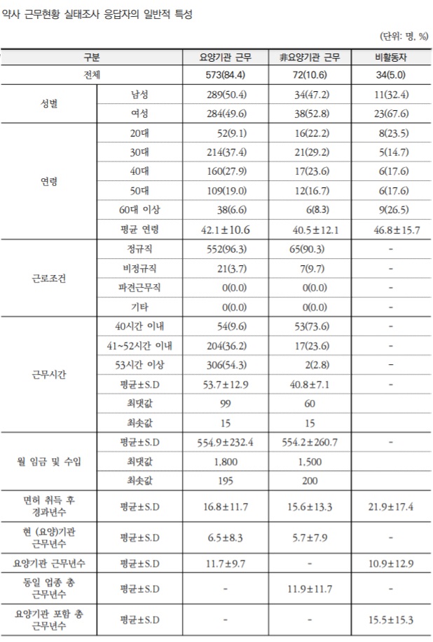 이번 조사는 679명의 약사가 온라인 설문을 통해 응답했다. 조사에 응답한 약사 679명 중 요양기관 근무인력이 573명(84.4%)으로 대부분을 차지했고, 비(非)요양기관 근무인력은 72명(10.6%), 현재 활동하지 않고있는 비활동 인력은 34명(5.0%)이었다. 또 약국 근무 응답자 중 개국약사 60%, 봉직약사 17%, 병원약사 23%였다. 성별로는 남성 50.4%, 여성 49.6%였다. 연령별로는 30대(37.4%), 40대(27.9%)가 가장 많았다.