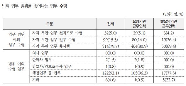 이와 함께 응답자의 20.3%가 자격과 무관한 업무를 수행하고 있는 것으로 나타났다. 자격과 무관한 업무를 일부 수행하는 응답자가 15.3%이고, 전적으로 수행하고 있는 응답자가 5.0%였다.