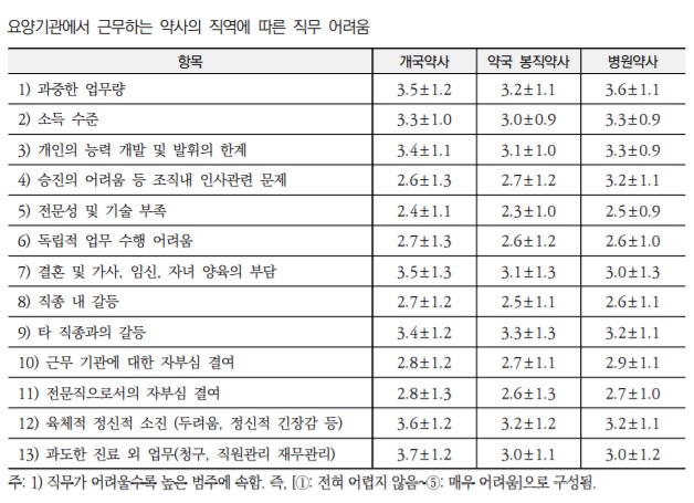 특히 개국약사는 다른 직역의 약사보다 '과도한 진료 외 업무'와 '결혼 및 가사, 임신, 자녀 양육의 부담'에 어려움을 느끼는것으로 나타났는데, 이는 혼자 요양기관을 경영하며 겪는 어려움 때문으로 분석되고 있다.