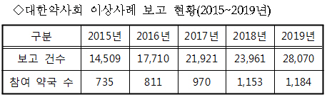 본부에 따르면 2019년 한 해 동안 대한약사회 이상사례보고 시스템을 통해 1,184개의 약국에서 총 28,070건의 이상사례가 접수돼 전년 대비 보고 약국수는 2.69%, 보고 건수는 17.15% 증가한 것으로 집계됐다.