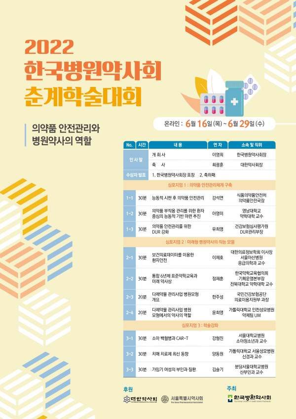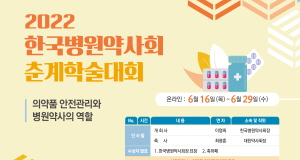 한국병원약사회(회장 이영희)가 오는 6월 16일부터 29일까지 2주간 ‘의약품 안전관리와 병원약사의 역할’을 주제로 ‘2022 온라인 춘계학술대회’를 개최한다.
