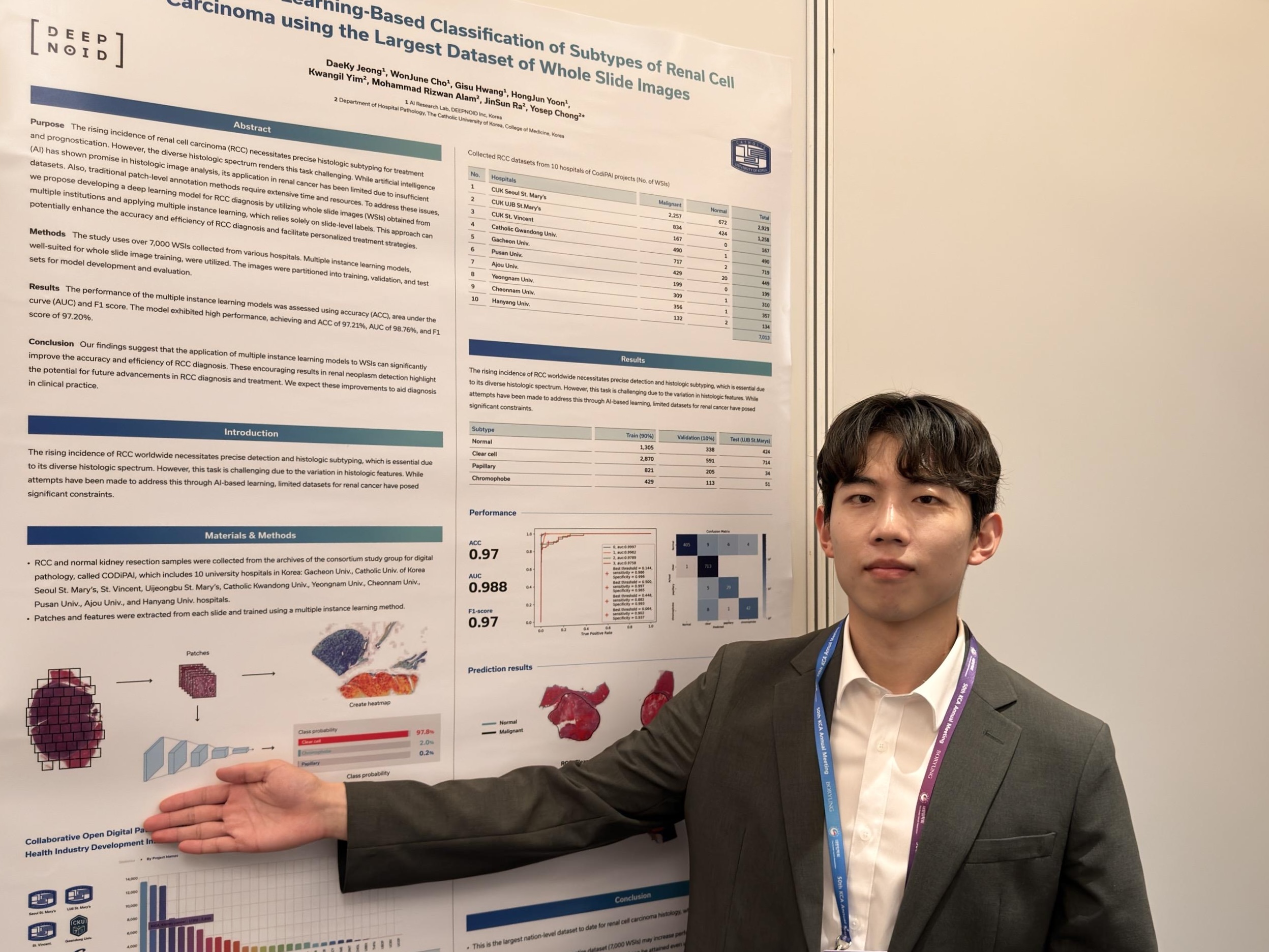 딥노이드가 발표한 포스터는 다중 인스턴스 학습(MIL; Multiple Instance Learning)에 기반한 신세포암종(RCC) 유형 분류 방법에 대한 연구다. 연구사업 주관기관인 가톨릭대학교 의정부성모병원을 비롯해 10개 기관에서 수집한 7,000장 이상의 전체 슬라이드 이미지(WSIs)를 활용해 학습됐으며, 이는 현재까지 국가 단위 데이터 세트로는 가장 큰 규모다.
