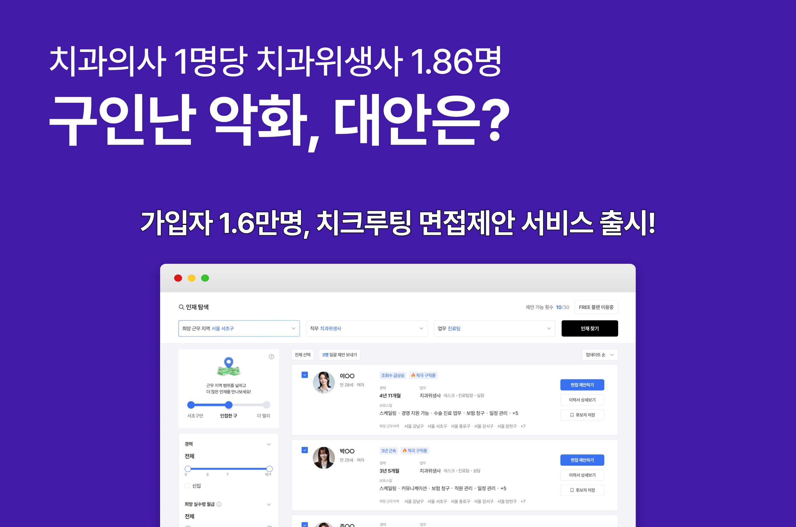 치과 전문 구인구직 플랫폼 ‘치크루팅’(대표 송언의)이 치과 인력 구인난 해결을 위해 ‘면접제안 서비스’를 출시했다고 11일 밝혔다.
