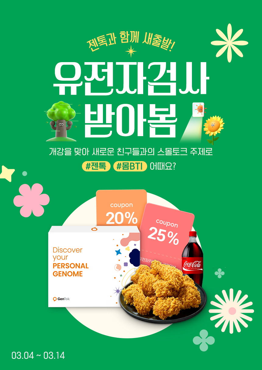 프로모션은 3월 14일까지 네이버 젠톡 스마트 스토어에서 진행하며, 마크로젠 대표 유전자검사 플랫폼 젠톡 유전자검사 키트 2개 구매시 20% 할인 쿠폰을, 3개 이상 구매시 25% 할인 쿠폰을 제공한다.