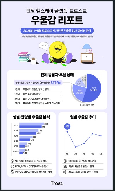이번 리포트는 2025년 1월부터 5월까지 총 90,892명이 참여한 우울증 검사 데이터를 기반으로 분석됐다. 트로스트의 우울증 검사는 1~4단계로 응답자 상태를 구분한다. 1단계는 ‘우울하지 않은 안정적 상태’, 2단계는 ‘표준 수준 우울함’, 3단계는 ‘표준 수준보다 조금 더 우울함’, 4단계는 ‘표준보다 많이 우울함을 느끼고 있는 상태’를 나타낸다.