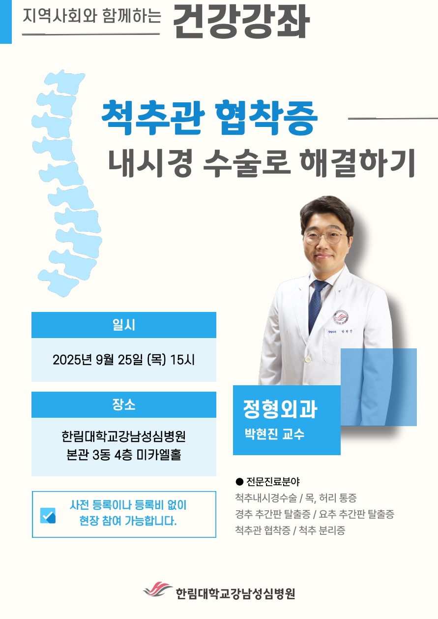 한림대학교강남성심병원(병원장 이동진)은 9월 25일 오후 3시 본관 3동 4층 미카엘홀에서 ‘척추관협착증 내시경 수술로 해결하기’ 주제로 건강강좌를 개최한다.
