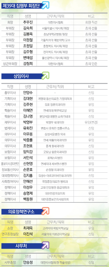 대한의사협회(회장 추무진)는 내달 1일부터 3년의 임기가 새롭게 시작되는 제39대 의협 집행부 임원 명단을 확정하여 발표했다.