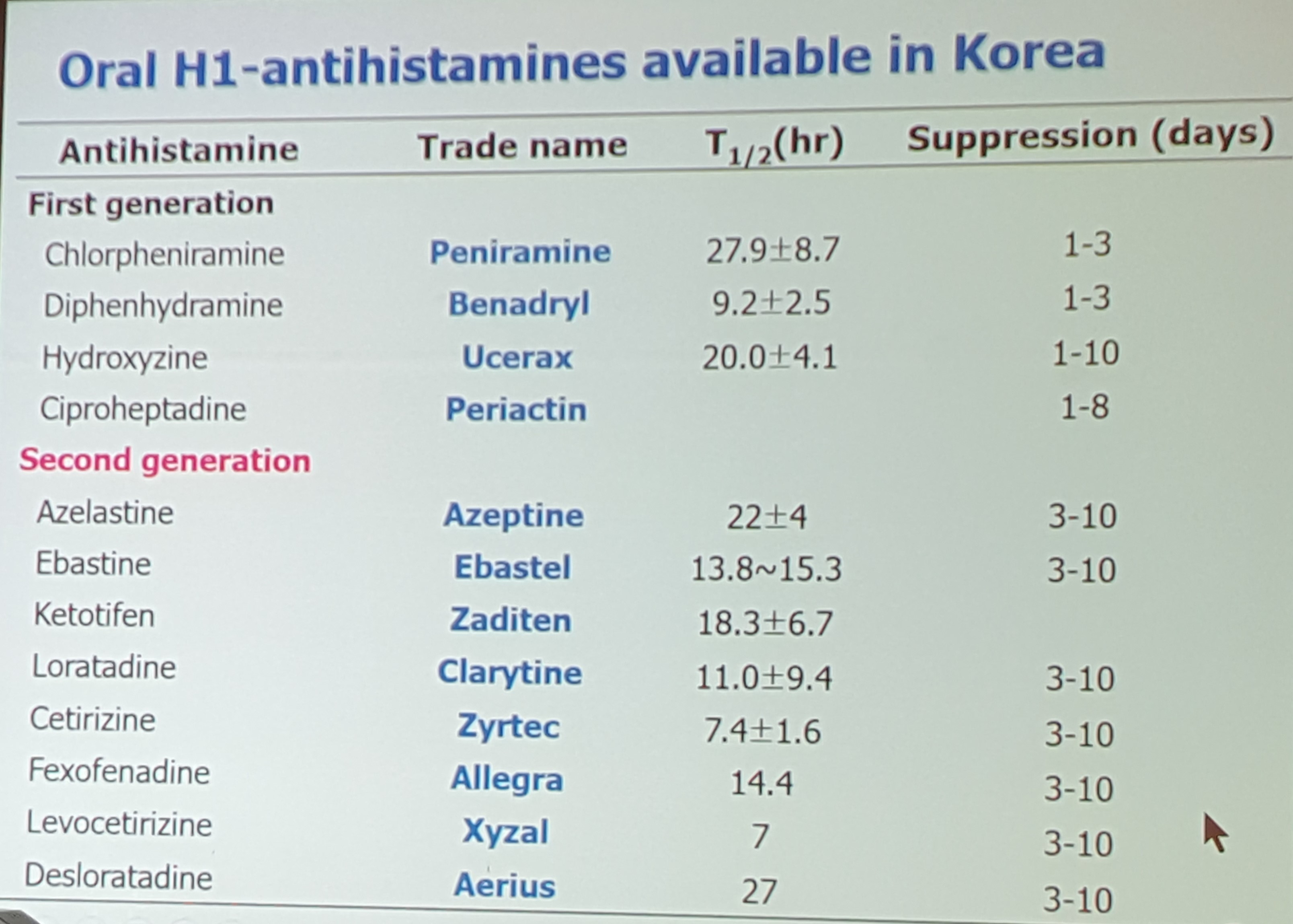 비염 증상이 나타나는 경우는 경구용 H1-antihistamines 또는 비강내 H1-antihistamines, decongestant, LTRA 사용을 권장한다”며 현재 한국에서 사용가능한 경구용 H1-antihistamines을 소개했다.