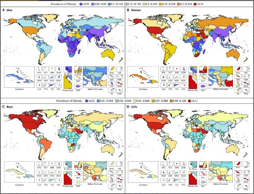 그 결과 2015년에는 총 1억 770만 명의 어린이와 6억 370만 명의 성인이 비만인 것으로 나타났으며, 1980년 이후 비만의 유병율은 70개국 이상에서 두 배가 됐고 대부분의 다른 나라에서도 꾸준히 증가했다.