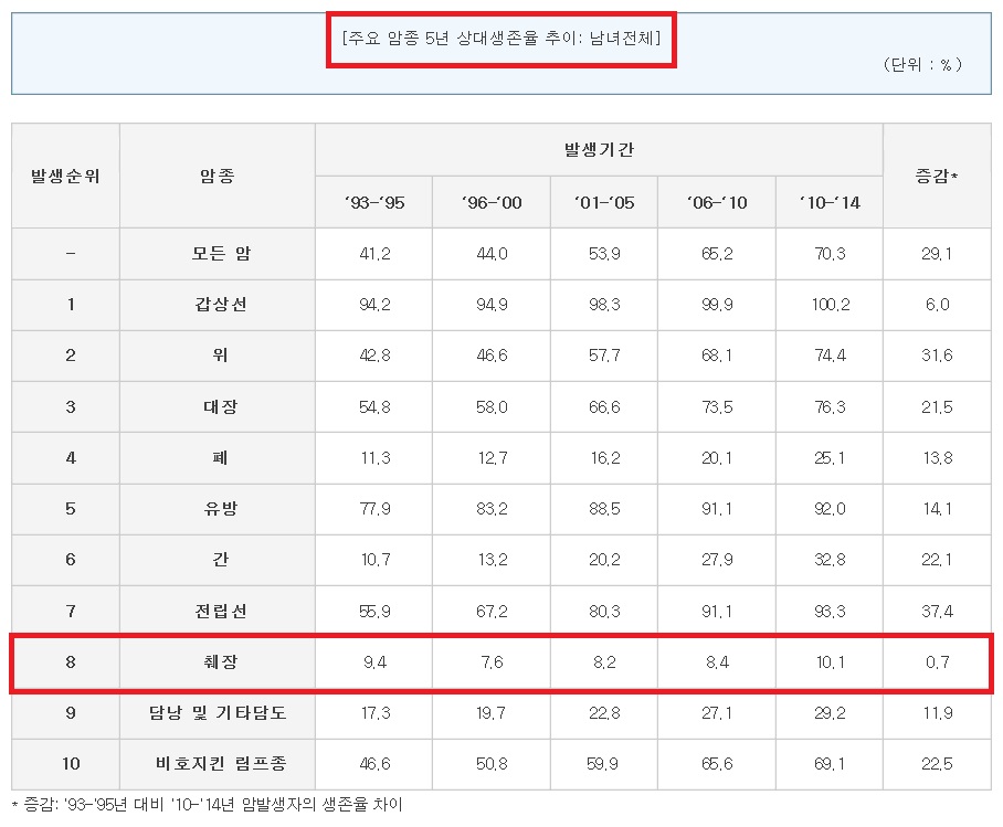 한편, 대부분의 암이 생존율 향상을 보이고 있으나, 췌장암의 경우 생존율 향상이 미미한 수준이다. 국가암등록본부 통계에 의하면 췌장암의 5년 생존율은 10% 정도로 10대 암 중에 최하위이자, 1993년 이후 지속적으로 생존율 향상 폭이 가장 낮은 암으로 기록되어 있다.