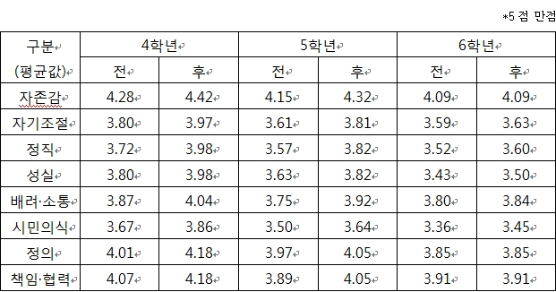 성별에 따라서는 4학년은 남녀학생 모두 모든 항목에서 긍정적인 변화가 나타났다. 5학년의 경우 남학생은 정의 영역을 뺀 나머지 7가지 영역에서, 여학생은 4학년과 마찬가지로 모든 항목에서 인성점수가 향상됐다.
