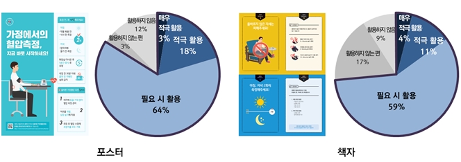 또, 10곳 당 7~8곳이(포스터 85%, 책자 74%) 교육자료를 유용하게 활용한 것으로 나타났다. 병원 내 부착 포스터는 특히 의원에서 많이 활용하였으며(종합병원 중 53%, 의원 중 70%), 책자는 주로 진료실 내에서 환자에게 가정혈압을 교육할 때 쓰였다(종합병원 중 45%, 의원 중 52%).