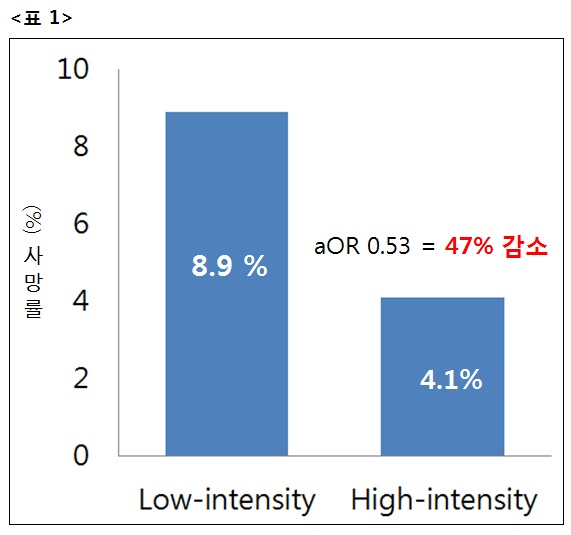 연구팀에 따르면 2013년 3월 이전 전담전문의와 다학제 진료가 없는 ‘낮은 관리그룹(low-intensity)’ 616명과 2013년 3월 이후 심장내과 중환자실에 ‘전담전문의’가 배치되고 다학제 진료를 받은 ‘높은 관리그룹(High-intensity)’ 1,815 명을 나눠 조사한 결과, 낮은 관리그룹 일 때 8.9%에서 높은 관리 그룹 에서는 4.1%(adjusted odds ratio, aOR 0.53)로 사망률이 47% 감소했다.